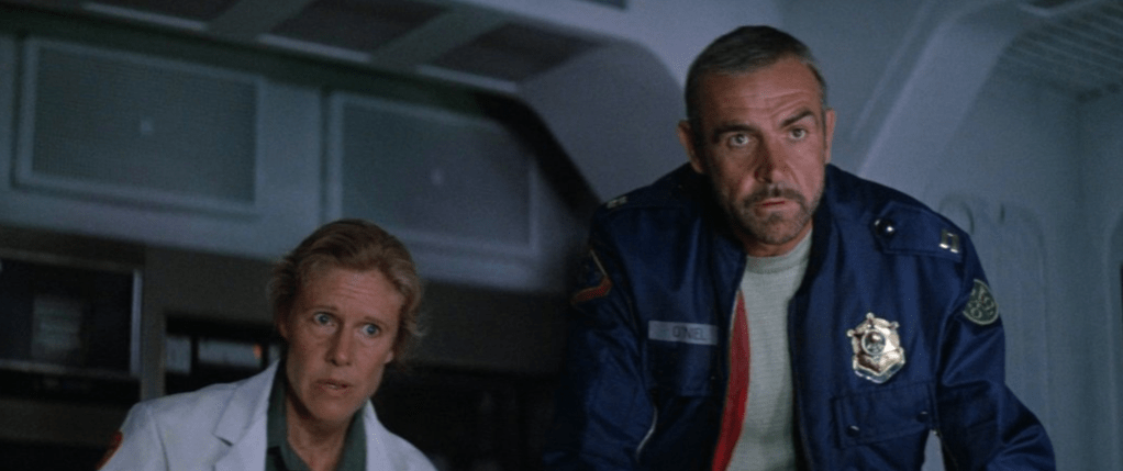 Connery (som vid tiden bastat 51) var på väg in i den »mogna« fasen av sin karriär – även om han inte slängt toupén riktigt än – och är strålande, särskilt i en fin scen där han pratar med sin fru och son via monitor. Hyams är snål med backstory men ger O’Niell precis så mycket som behövs för att vi ska förstå hans val. Connery får sparring i toppklass av Frances Sternhagen, en av mina absoluta birollsfavoriter. Vi minns henne som psykolog i De Palmas Raising Cain (det är ju hon som har mastig expositions-monolog i den där evighetslånga steadicam-tagningen) och senare som pigg 80-plussare i Rob Reiners charmiga And So It Goes. I Operation Outland spelar hon en rivig läkare som är den enda O’Niell kan lita på. Hon gör den roll hon brukar göra: en strävkäftad och bittert rolig no nonsense-brutta med ett hjärta av guld.