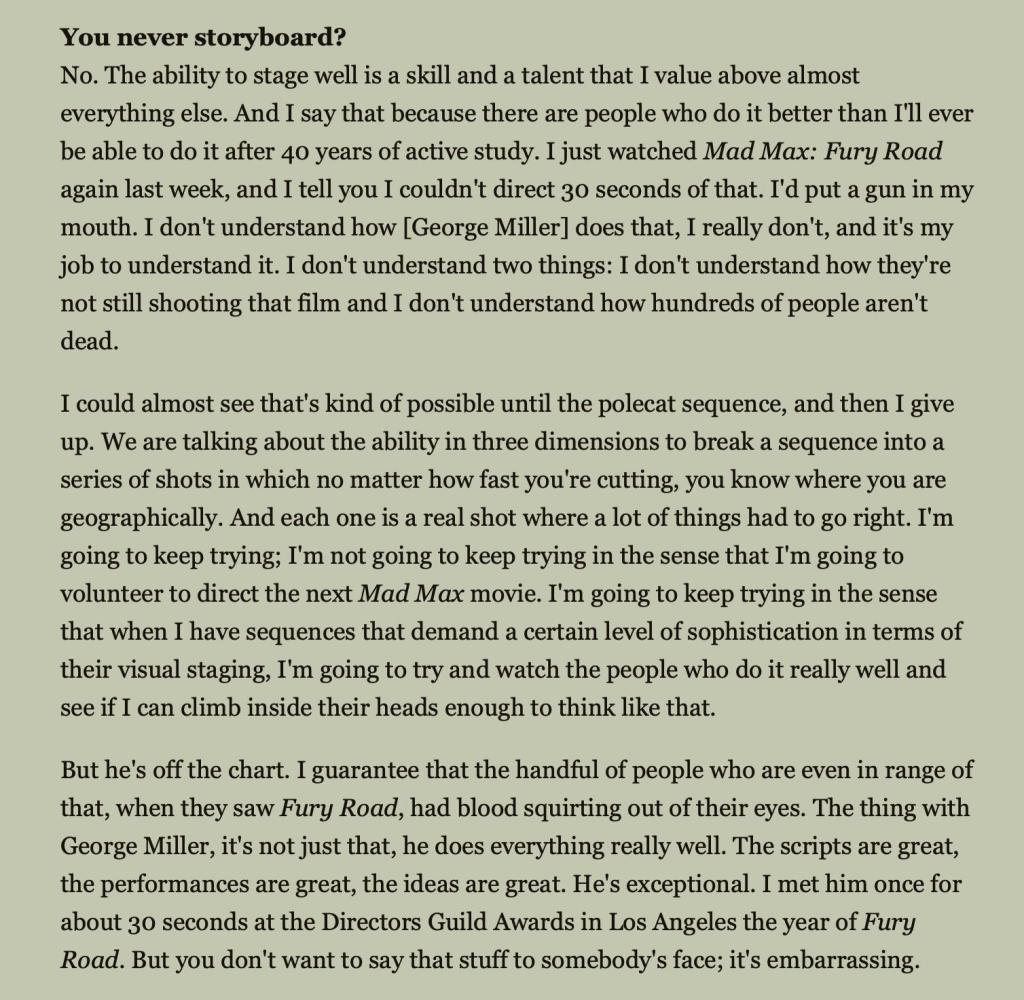 De senaste årens imponerande output — tio långfilmer och tre-fyra serier på tio år inklusive kommande spiondramat Black Bag (2025) — rör sig ledigt från neo-noir och politisk satir till basketdrama och covid-thriller. Han är smart nog att för det mesta outsourca manusarbetet till veteraner som David Koepp, samtidigt som han själv tar hand om både regi, foto (som Peter Andrews) och klipp (som Mary Ann Bernard). Dessutom verkar han vara en trevlig typ, och han är en riktig jävla filmnörd också — hans diverse observationer och analyser av samtidsfilm, som letar sig in i intervjuer och dylikt, är alltid värda att ta del av, som hans redan klassiska ord om Mad Max: Fury Road (2015):