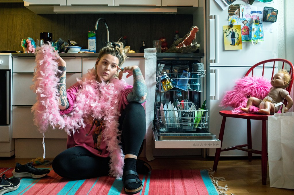 Vi följer henne på provfilmningar, manusgnet, träliga zoom-möten med SVT, mysigt vardagshäng med hennes väldigt stödjande mamma och allmänt harvande för att få vardagen att funka. Inte lätt med två små barn varav ett med särskilda behov och en sambo som får dra ett stort lass själv, genom sammanbitna tänder.