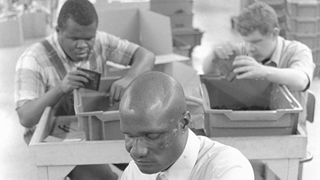 En companion piece till Wisemans lika utmärkta dokumentär Blind (1987). Adjustment & Work är också inspelad i Alabama, men där Blind fokuserar på blinda barns skolgång har denna film vuxna i fokus, och inte bara blinda utan även döva och personer med andra funktionsvariationer. Som vanligt hos Wiseman är det återhållsamt empatiskt skildrat, men utan några krusiduller som musik eller andra emotionella pekpinnar. Filmen visar hur godtyckligt samhället (åtminstone då filmen gjordes) delar upp människor i ”normala” och ”handikappade” oavsett variation — vuxna människor sitter i samma klasser och lär sig rudimentär hushållsekonomi oavsett funktionshinder; personer med grava kognitiva nedsättningar får samma undervisning som synskadade personer, osv. Sak samma, de är ju handikappade hela högen, tycks man resonera.